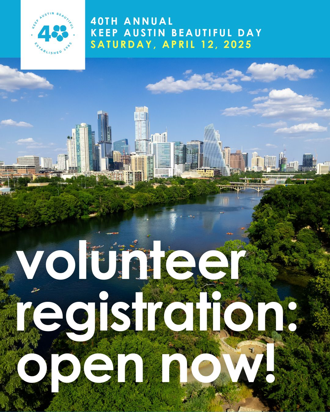 Join Keep Austin Beautiful and thousands of other volunteers for an incredible day of community service throughout the Greater Austin Area in honor of Earth Month! Volunteers have 100+ sites to choose from to volunteer on Saturday, April 12th. Schools can participate in a Keep Austin Beautiful Day campus clean up the week leading up to or week after Keep Austin Beautiful Day during school hours.