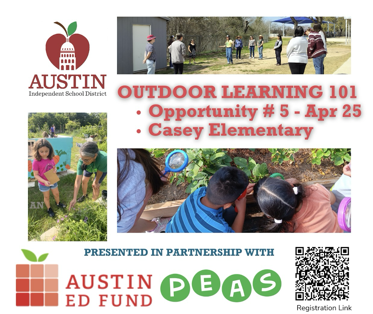 AISD elementary teachers are invited to join an Outdoor Learning 101 Professional Development session at Casey Elementary on April 25th to celebrate Mother Earth and the joyful connections we cultivate through Outdoor Learning. Subs will be reimbursed. Sign up through this link! Secondary teachers, be on the lookout for information for Outdoor Learning 102 in May!