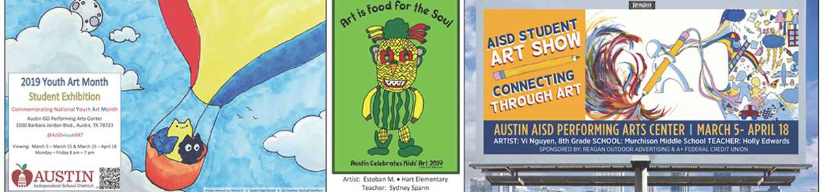 - Also displayed were the Youth Art Month contest winner artworks: Esteban M. from Hart Elementary for the T-shirt contest, Vi N. from Murchison Middle School for the billboard contest and Theron P. from Austin High for the poster contest.