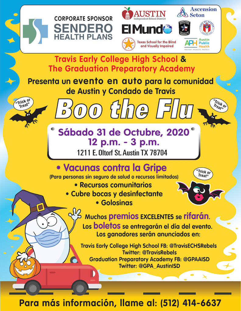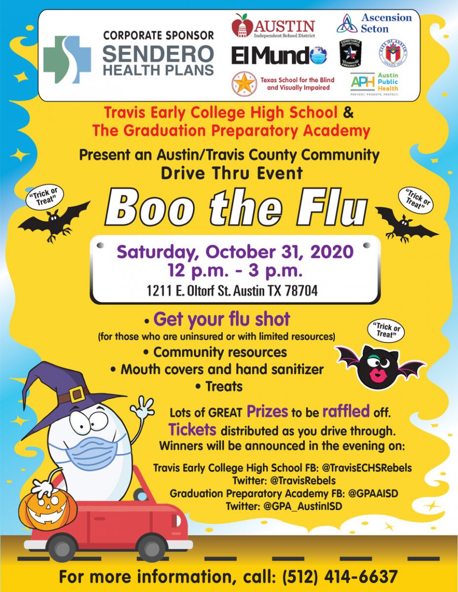 This spooky season just got a little less spooky as Austin ISD, in partnership with Sendero Health Plans, will hold Boo the Flu this Saturday, Oct. 31 from noon to 3 p.m. at Travis Early College High School and the Graduation Preparatory Academy at Travis, 1211 E. Oltorf St. Austin, TX 78704.