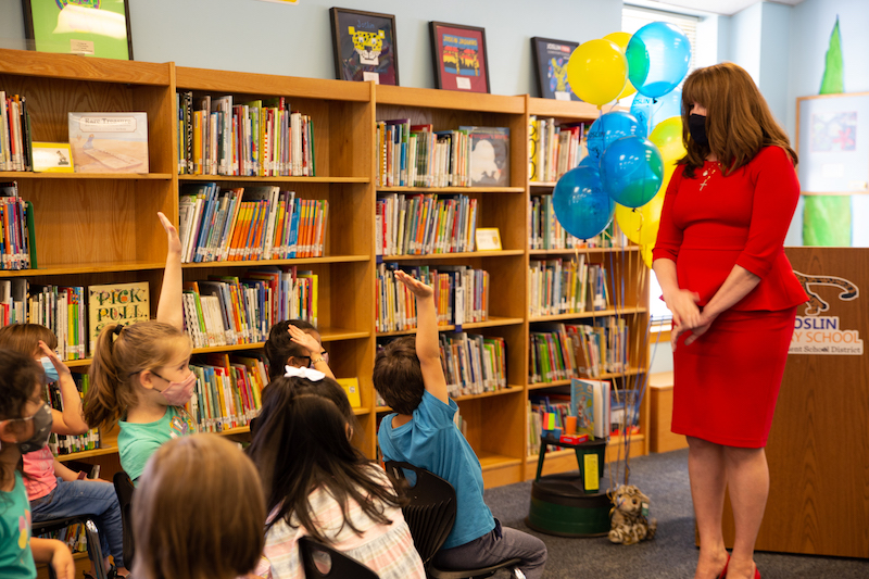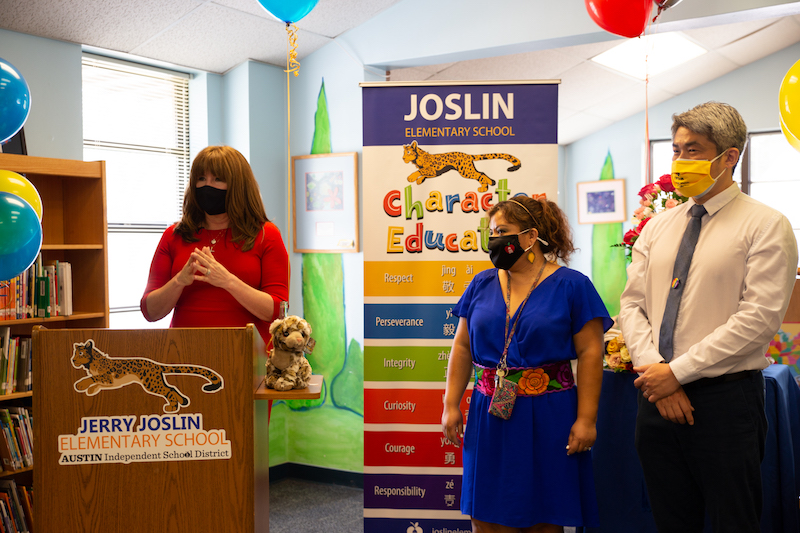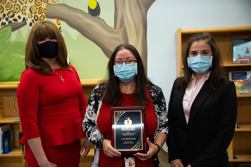 Dr. Elizalde began her morning at Walnut Creek Elementary where proud students and staff sat in socially distanced seating in the library enjoying breakfast tacos and donuts. She honored dual-language second grade teacher Lisa Richardson who has taught in Austin ISD for five years.
