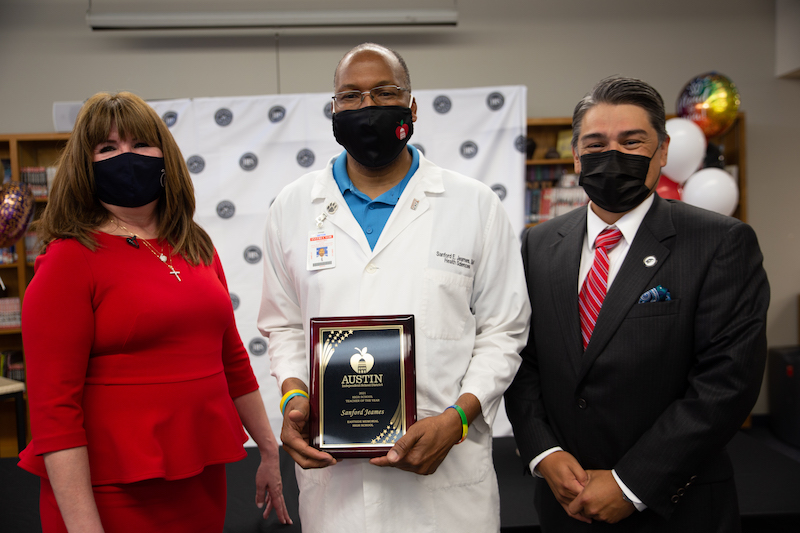 Jeames, a health science program coordinator who is commonly seen in his lab coat, has been with AISD for eight years. He has spent time in the United States Army Reserve and has brought an expectation of excellence to his classroom.