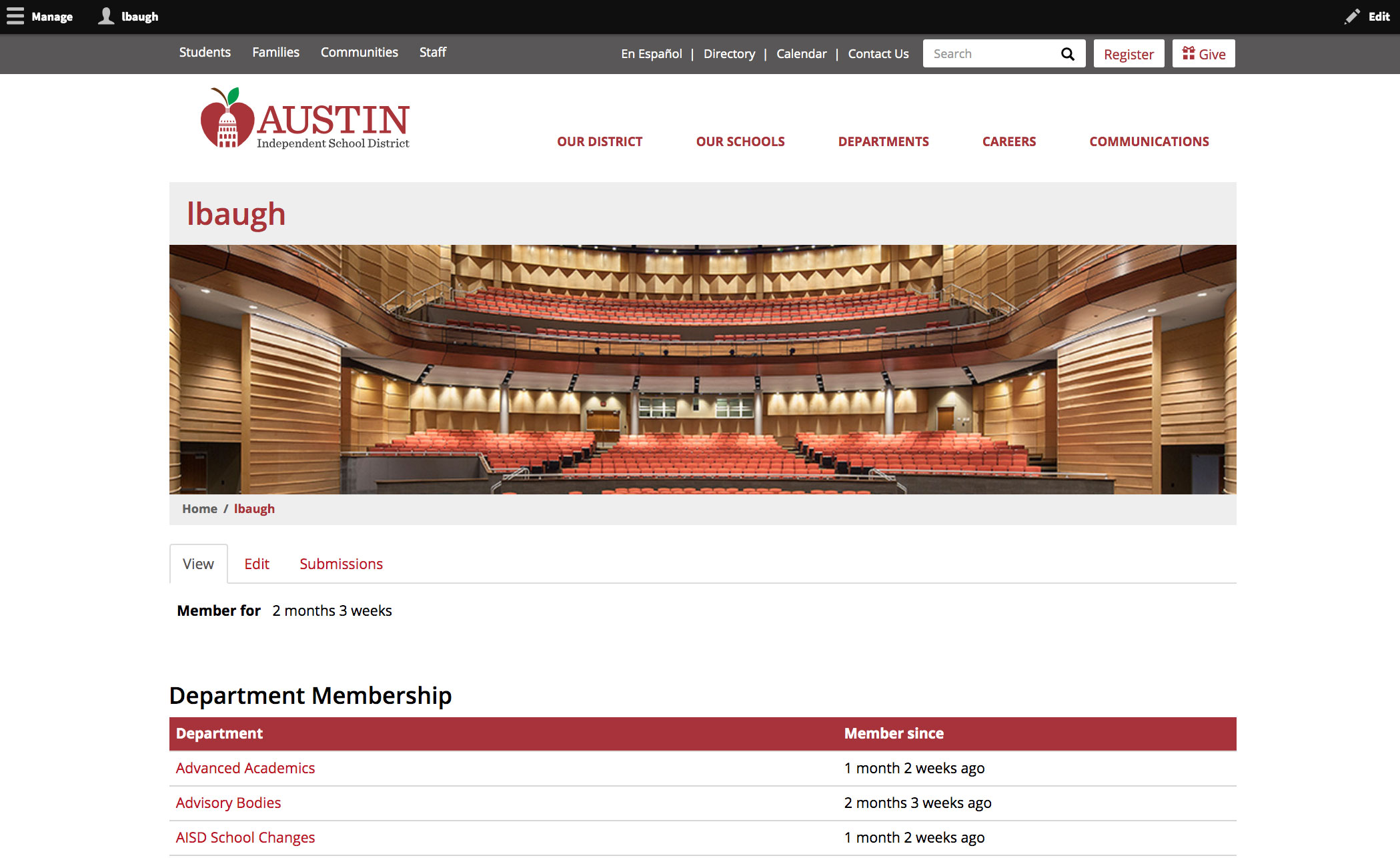 This page will display which areas you are able to edit (under “Group Membership”). For most people this will be one department. You can click on the department name to go to directly to that page. You can click on the “Edit” tab to update/change your password.
