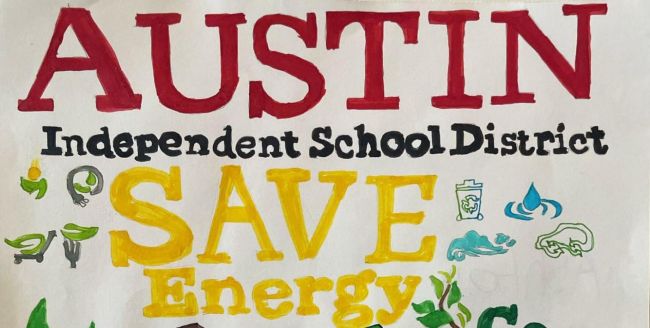 Visit the AISD Energy & Water Management webpage to see your school’s energy and water use, use the energy and water conservation checklists, and sign up for the energy & water conservation training for your school or work group. Image: Artwork by Eastside Early College High School student.