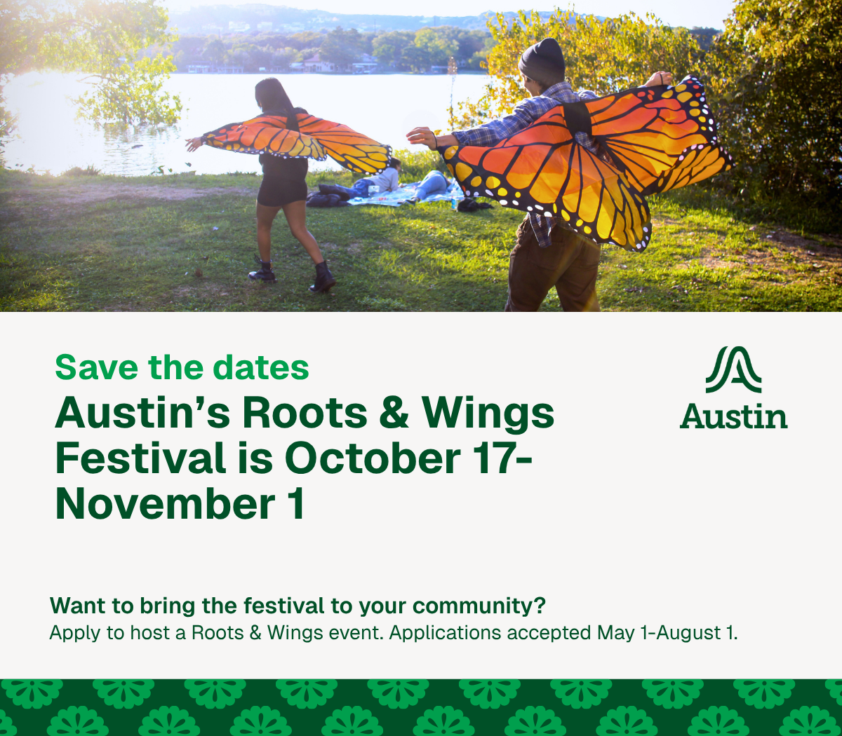 Riding the wave of Earth Day festivities, the 9th annual Roots & Wings Festival occurs this fall, 10/17 through 11/1! Does your school want to host a special event to celebrate trees, bees, butterflies or many other beautiful expressions of nature? City of Austin mini-grants are available to help fund it, along with resources and information to assist your school committee every step of the way! The application deadline is August 1st. For more information and to receive the event calendar in October, visit us here!