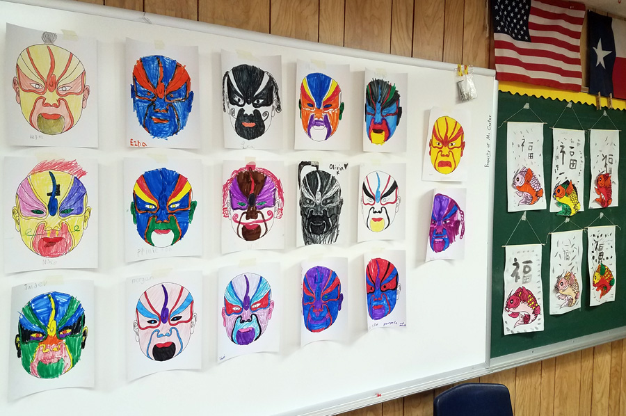 Nancy Chiu’s second-grade class displays their Beijing opera mask artwork.