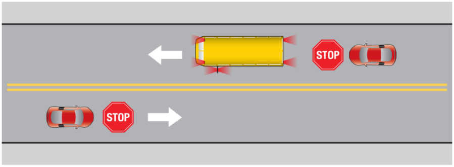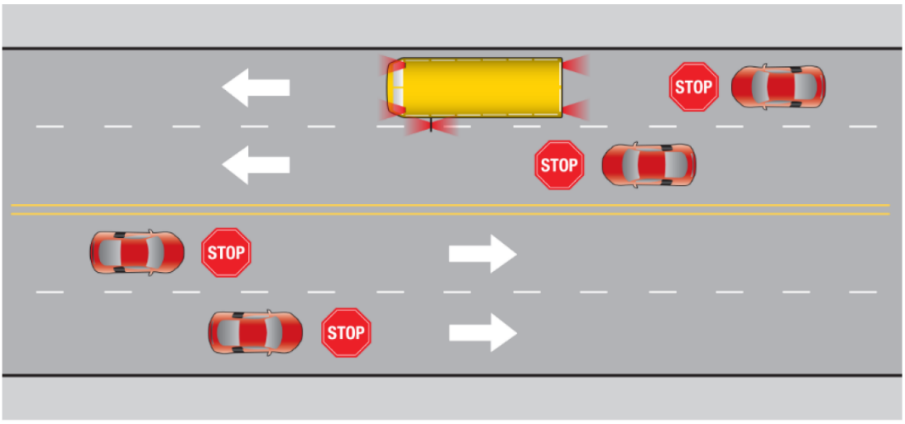 Section 545.066 of the Texas Transportation Code defines the offense of Passing a School Bus as: An operator on a highway, when approaching from either direction a school bus stopped on the highway to receive or discharge a student shall stop before reaching the school bus when the bus is operating a visual signal as required by Section 547.701; and may not proceed until the school bus resumes motion; the operator is signaled by the bus driver to proceed; or the visual signal is no longer actuated. An operator on a highway having separate roadways is not required to stop for a school bus that is on a different roadway; or if on a controlled-access highway, for a school bus that is stopped in a loading zone that is a part of or adjacent to the highway; and where pedestrians are not permitted to cross the roadway.